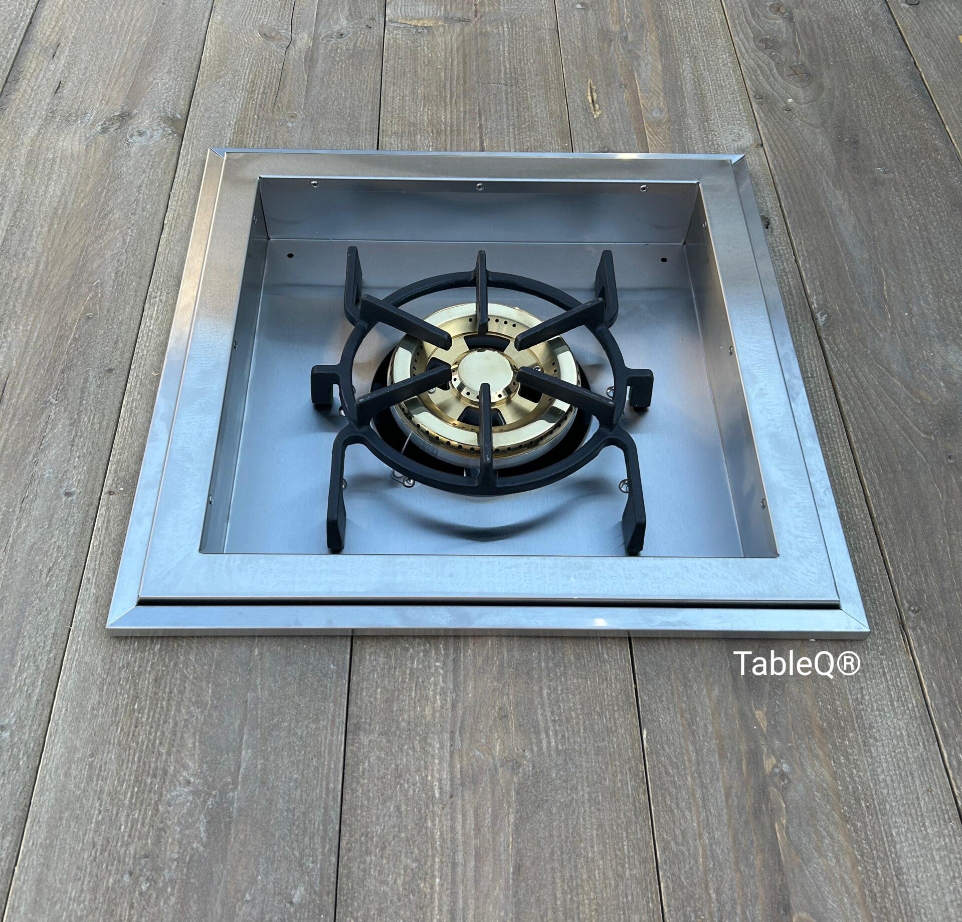 Grote barbecuetafel met drie keer een professionele gas barbecue en een wokbrander op gas voor maximale kookvrijheid. Voeg een RVS bowl toe voor drank, koude gerechten of sfeervuur. Zo ontstaat een veelzijdige bbq tafel waarin grill barbecueën en gezelligheid samenkomen.