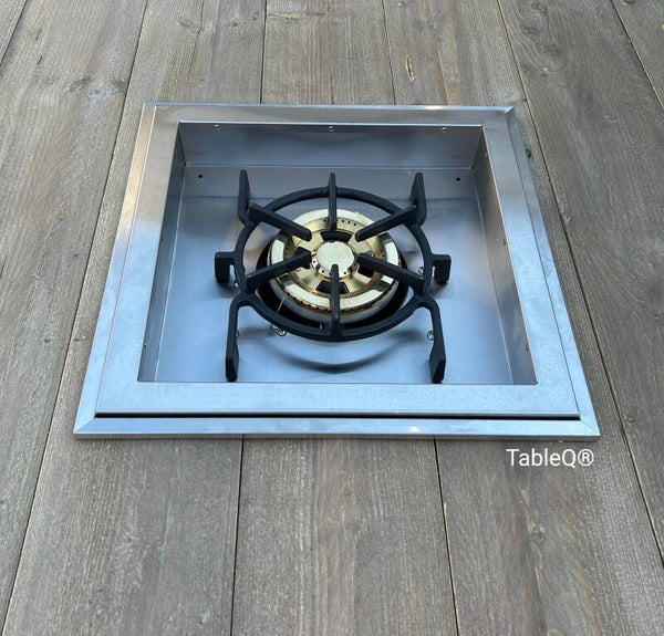 Buiten tafel met ingebouwde gaspit / wokbrander voor het bereiden van groenten of het warmhouden van gerechten tijdens het barbecueën. Deze tafel kan worden uitgebreid met een houtskool- of gas barbecue of RVS bowl, zodat je flexibel wisselt tussen bbq tafel, dranktafel en vuurtafel. De gasslang met drukverdeler is inbegrepen.